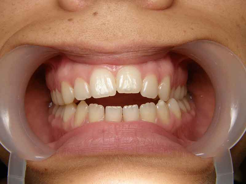 Les incisives supérieures présentent des diastèmes — des espaces interdentaires visibles, dont un diastème central prononcé.